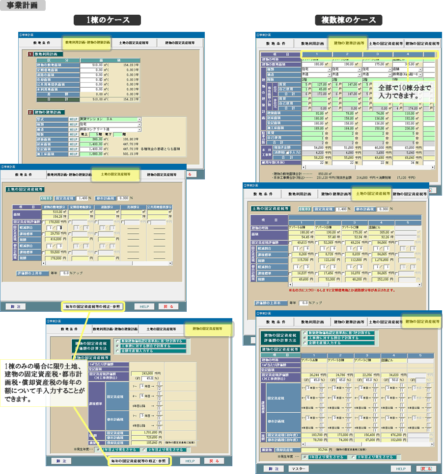 これは敷地条件や建築計画等を入力する画面です。自宅併用、店舗併用アパート等でもOKです。